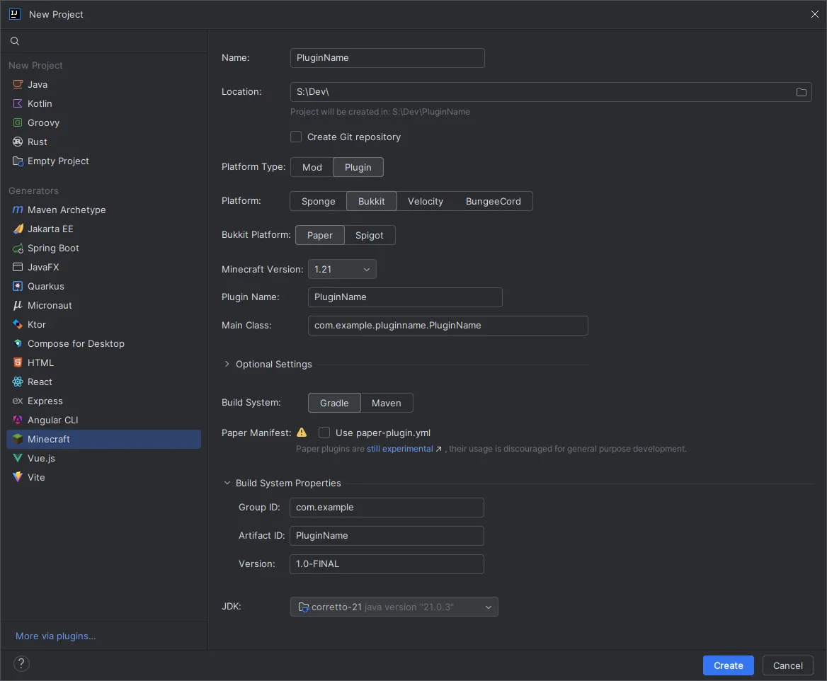 Build SystemThe build system you want to use. Paper recommends using Gradle but you can use Maven if you prefer.